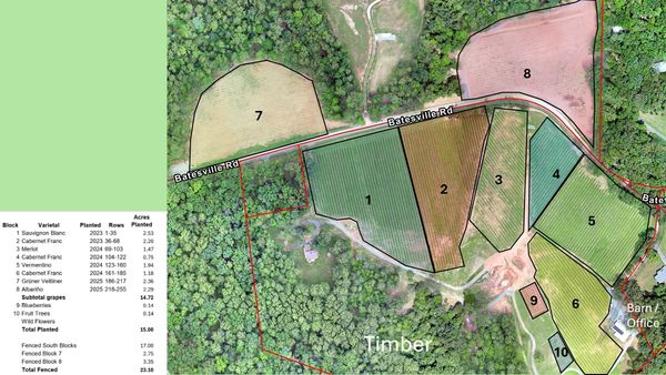 With the goal of becoming a wholesale supplier of high-quality wine grapes, Waverly Farms began developing a vineyard on a 26-acre site near Batesville, Virginia in April 2023. Located just six miles from the Blue Ridge Parkway, the site was previously used as a horse pasture and, earlier, as part of a 160-acre apple orchard dating back to the 19th century.